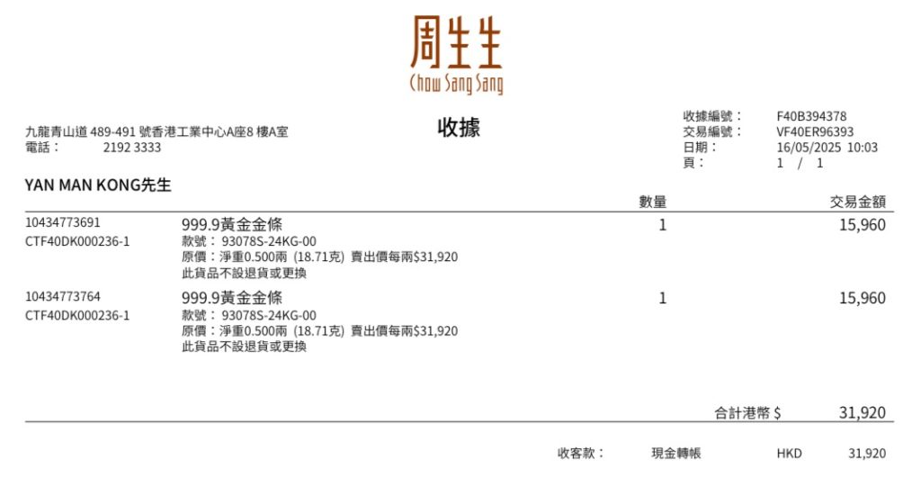 當天兩粒半兩裝合共$31,920卻沒想到今天竟升值到$36,660這樣高。升幅是14.7%!!!