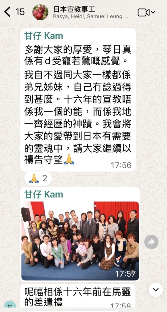 甘仔在日本宣教事工群組內,分享過覺得昨天有點受寵若驚!但若過份把回來的宣教士如一般人所接待,他們過去為神所付出卻無人記得那是多可惜的事。